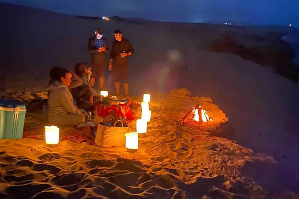 After sunset, enjoy a freshly prepared Moroccan tagine, soft drinks and fresh seasonal fruits served in a magical desert setting.